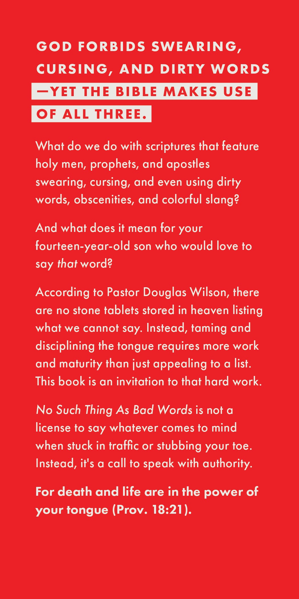 According to Pastor Douglas Wilson, there are no stone tablets stored in heaven listing what we cannot say. Instead, taming and disciplining the tongue requires more work and maturity than just appealing to a list. This book is an invitation to that hard work.
